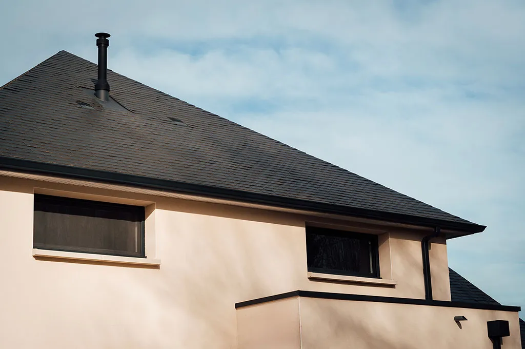 Sur le plan technique, la maison combine toiture plate partielle et toiture principale en ardoise, plancher chauffant, et isolation conforme à la réglementation Bbio, garantissant confort et économie d’énergie tout au long de l’année.